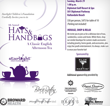 Fort Lauderdale, FL (January 21, 2008) – Starlight Starbright Children’s Foundation is pleased to announce it will once again be hosting its annual Hats & Handbags, A Classic English Afternoon Tea on Sunday, March 9th beginning at 1:30pm at the newly renovated Hyatt Pier 66 on the 17th Street Causeway in Fort Lauderdale.