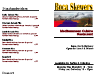 You will also find soups, salads and rice. Some entrees include Chicken Kebab and Lamb Shank (just to name a couple). Boca Skewers also has a beer and wine list. They offer a house Cabernet too! For great authentic Greek and Middle Eastern type food with excellent pricing and taste, join us at BOCA SKEWERS. We serve the taste you've been looking for!