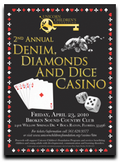 Event: 2nd Annual Denim, Diamonds & Dice Casino Night Date: Friday, April 23, 2010 Time: 7:00 PM Web:Click Here! Location: Broken Sound Country Club | Boca Raton, FL
