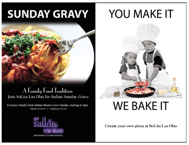 The Best Taste on Las Olas! Whether you are taking a stroll down the boulevard and want a Leisure Lunch or you want to close the deal at a Power Lunch - SoLita is "The Place" for Lunch. Serving old school sandwiches, pasta, pizza and salad. Lunch hours are Monday - Saturday from 11:30 AM to 3 PM. Take-out available.