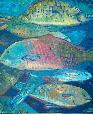 The artist is inspired by early mornings and late afternoons when the island becomes rich in texture and bold in color. Lucinda's current works capture these times with the thick medium of oil. These paintings are a study of radiance in abstract with overtones of tropical colors and patterns.