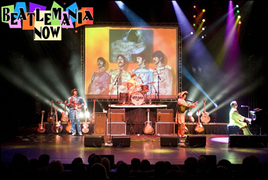 "BEATLEMANIA NOW" is the ultimate multimedia and musical stageshow touring the world today! Through nine scenes (in two acts), witness the dramatic impact and feel the pure nostalgia as "BEATLEMANIA NOW" recaptures the excitment, mood, and frantic intensity of the 1960s all set against a stunning multi-media backdrop of live images and visual montage featuring news clips, documentary reels, and movie and concert footage. The collaged visuals, spanning the era of JFK's last days as president, through the Chicago Democratic convention, Flower Power, Kent State, and the raging war in Vietnam are the accompaniment for the live on stage performance of BEATLEMANIA NOW's four-member cast. The quartet's live meticulous recreation of the sounds of over thirty Beatles' classics (including songs that the Beatles themselves never performed in public concert) along with the visual barrage of multimedia, and jaw dropping stage effects are what make "BEATLEMANIA NOW" the ultimate Beatles experience for fans of all ages.