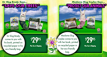 Each character in the book has a mission - Sir Slug Brady saves our trees, Madame Slug Caylee protects the animals, Sir Slug Bryson respects the ozone, Madame Slug Holland promotes healthy living by eating organic, Sir Slug Charlie recycles and Madames Slug Ady asks that you please take care of our oceans.